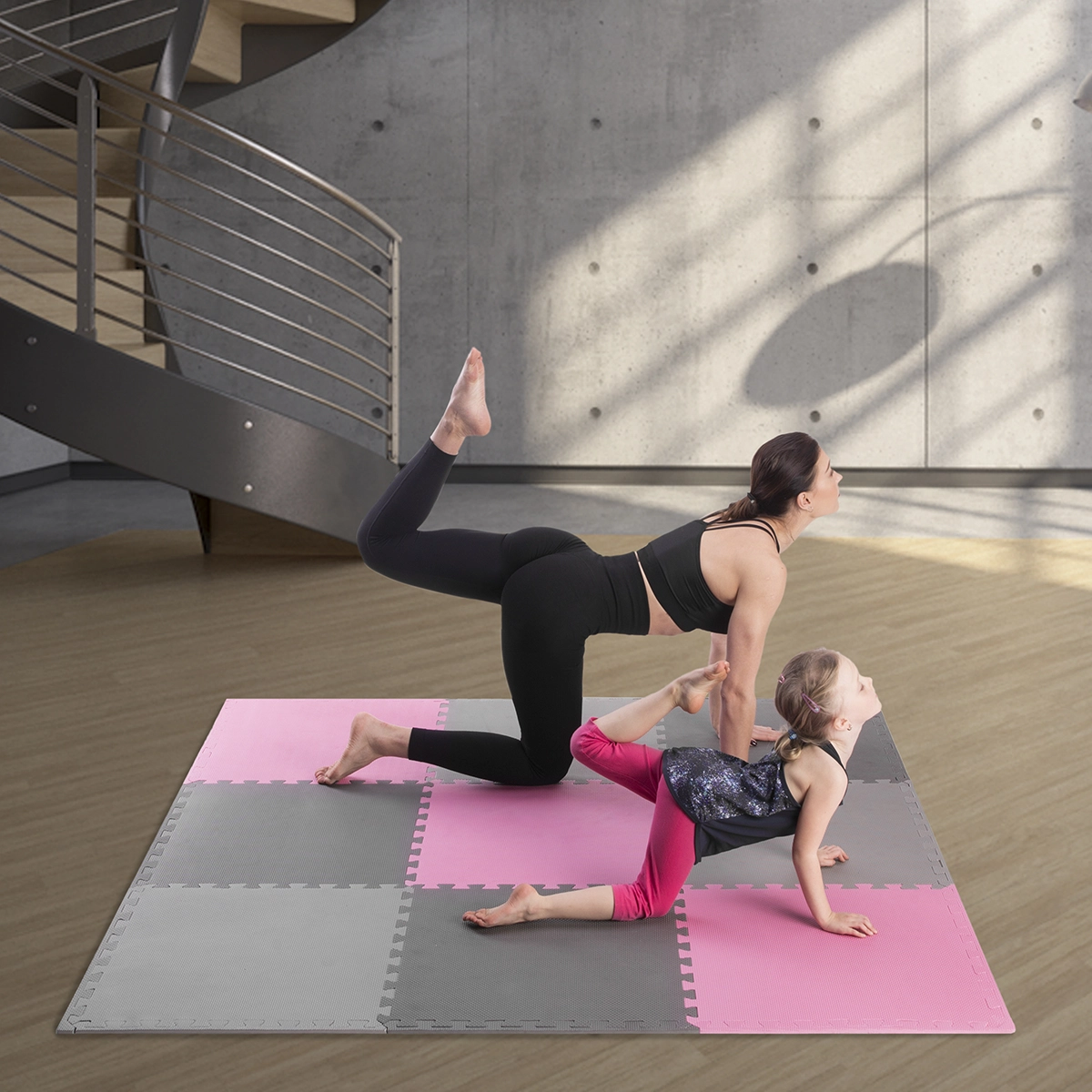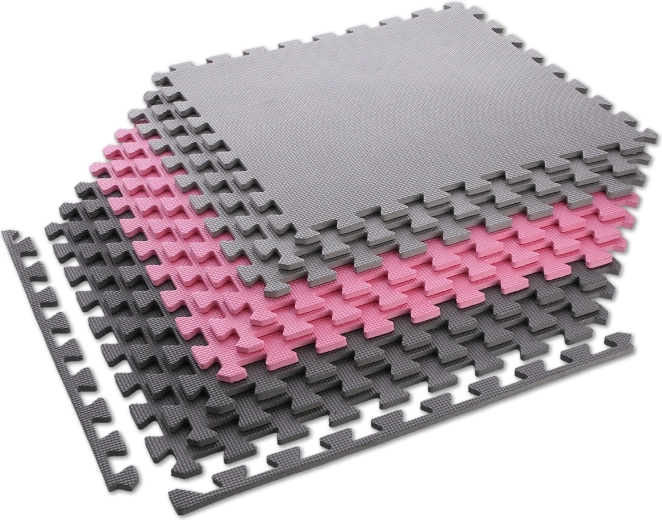 Elk deel heeft vergrendelingen rondom, zodat je zowel kleine zones als een volledige kamer kunt leggen. De set bevat 9 vierkante tegels in roze, licht- en donkergrijs en 12 afwerklijsten voor strakke, rechte randen zonder kartels.