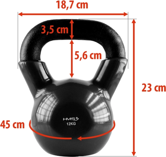 De HMS-kettlebell 12 kg is een betrouwbare keuze voor thuistraining en je persoonlijke fitnessroutine. De gietijzeren kern met een vinylcoating beschermt de vloer, dempt geluid en maakt onderhoud eenvoudig. De ergonomisch gevormde greep biedt een veilige houvast bij swings, squats en shoulder presses.