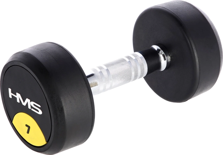De HMS HG Pro 7 kg is een hoogwaardige rubber gecoate halter voor krachttraining, geschikt voor zowel de thuisgym als commerciële fitnesscentra. De gietijzeren kern met een dikke rubberlaag verhoogt de duurzaamheid, vermindert het geluid en beschermt de vloer. De ergonomisch gevormde, verchroomde stalen handgreep met karteling zorgt voor een zekere en comfortabele grip bij oefeningen zoals bicep curls, shoulder press en side raises.