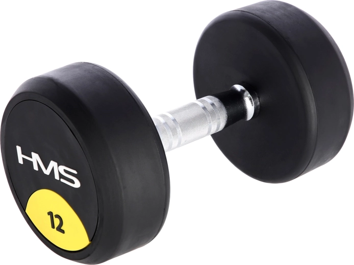 De 12 kg HMS HG Pro halter is ontworpen voor intensieve krachttraining. De gietijzeren kop is beschermd door een dikke rubberlaag die schokken dempt, het geluidsniveau verlaagt en zowel de vloer als de halter beschermt. De ergonomische, tonvormige handgreep van verchroomd staal met uitgesproken knurling zorgt voor een zekere en comfortabele greep, ook tijdens zware sets.