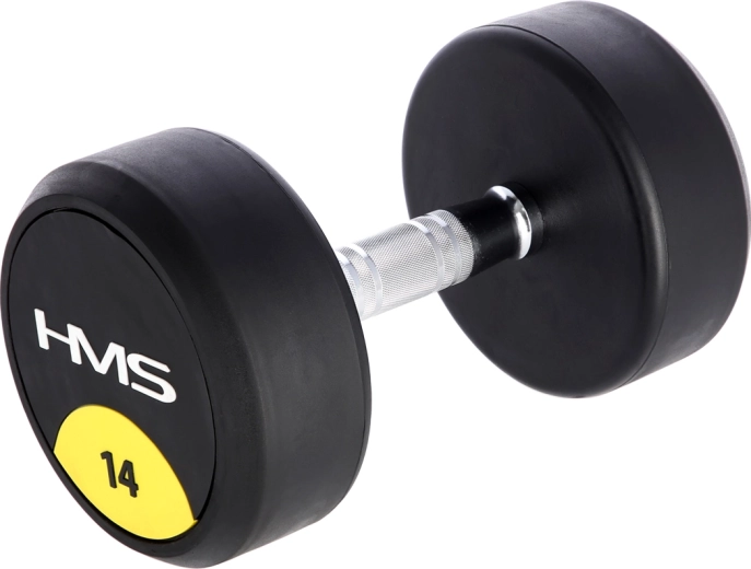 De HMS HG Pro 14 kg is een robuuste halter, ontworpen voor intensieve krachttraining. Het gietijzeren lichaam is bedekt met een dikke laag rubber die schokken absorbeert, de vloer beschermt en het geluidsniveau verlaagt. De ergonomische, tonvormige handgreep van verchroomd staal met diepe karteling garandeert een zekere en comfortabele greep, zelfs bij veeleisende sets.