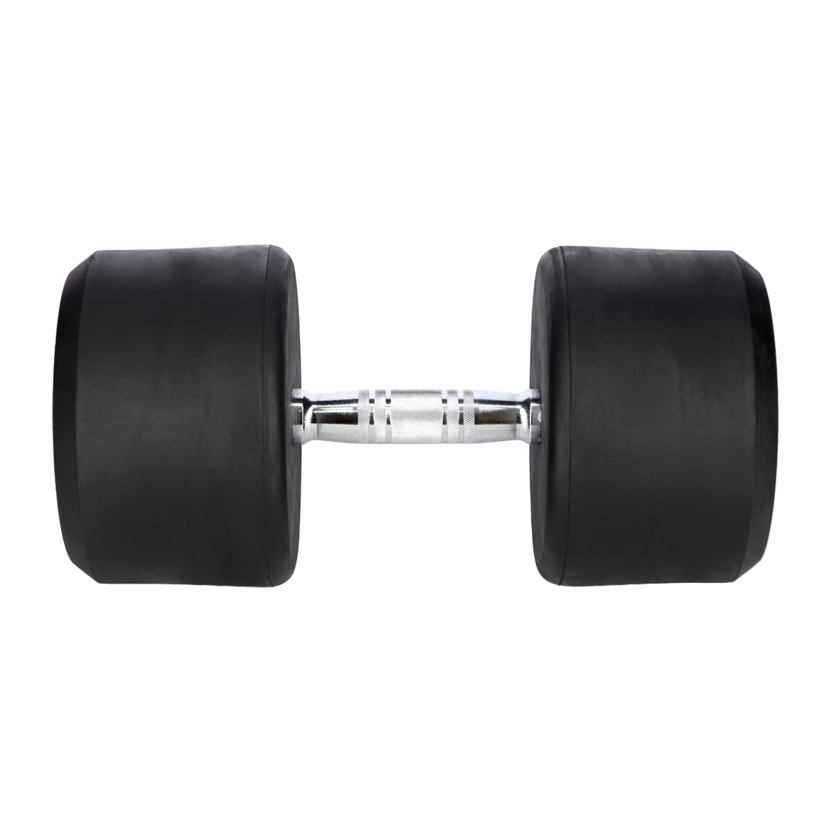 De dikke rubberlaag op de gietijzeren kern dempt schokken, beschermt zowel de vloer als de halter en vermindert geluid bij het neerleggen.