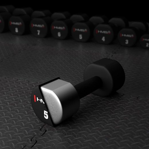 De set van twee HMS HPT dumbbells 2 × 5 kg combineert een stalen kern met een zwarte laag thermoplastisch polyurethaan (TPU) voor maximale duurzaamheid en comfort. Het oppervlak is reukloos, beschermt de vloer en dempt geluid, waardoor het geschikt is voor zowel thuis- als commerciële sportscholen. De gekartelde grip biedt zekere controle, ook bij intensieve sets.