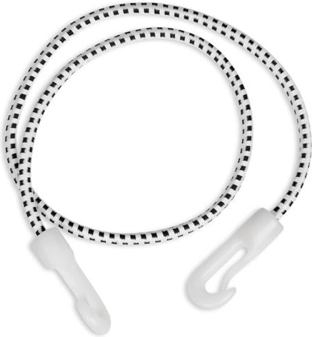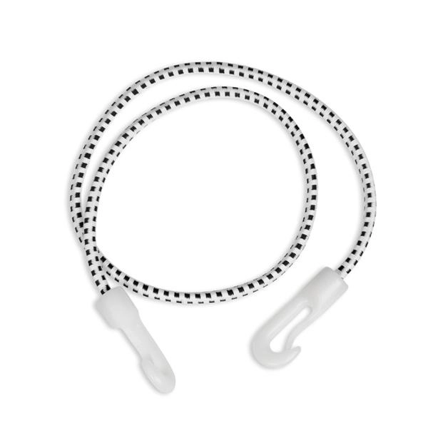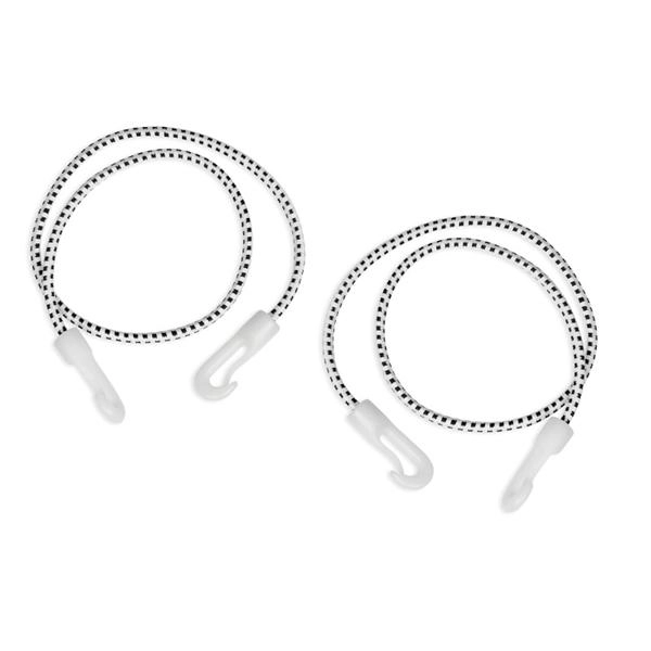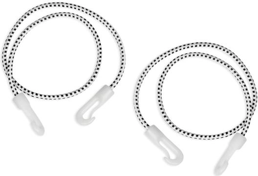 Twee montage-elastieken met karabiners van gehard kunststof voor snelle bevestiging tussen vloer en plafond in ruimtes met een hoogte van 180–300 cm.