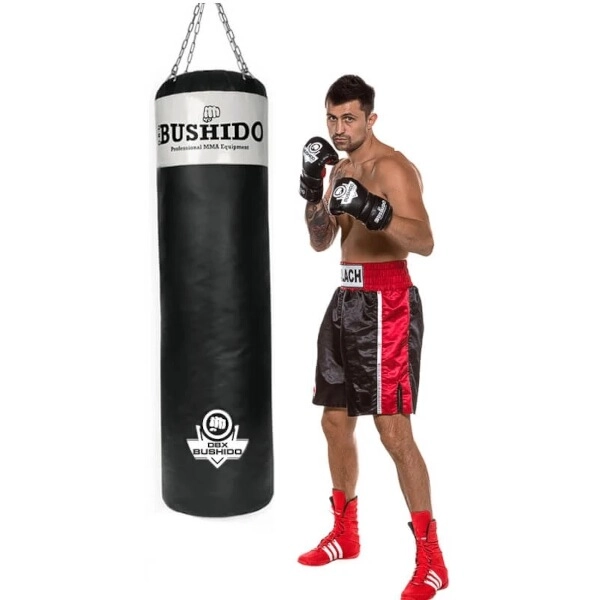 Professionele bokszak DBX Bushido met afmetingen 140 × 40 cm, klaar om te vullen naar jouw voorkeur. Biedt een extreem duurzaam 7-laags materiaal, gelaste kettingen en een draaibare ophangoog voor soepele trainingen zonder torderen. Ideaal voor thuis- en clubgebruik.