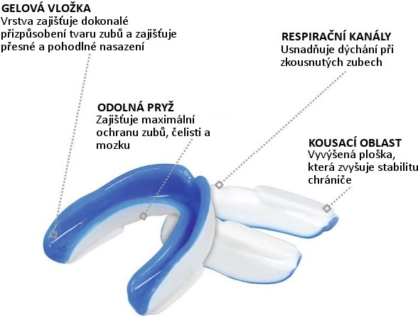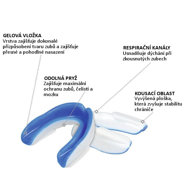 Universele gebitsbeschermer voor contactsporten met een dubbellaagse constructie voor maximale veiligheid en comfort. De innerlijke gel-laag zorgt voor comfortabele pasvorm, terwijl de buitenste geharde rubberlaag met luchtkanalen voor gemakkelijke ademhaling en stabilisatievlakken de beschermer stevig op zijn plaats houdt bij de beet.