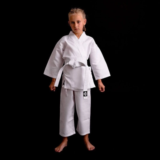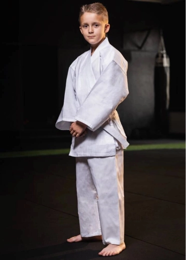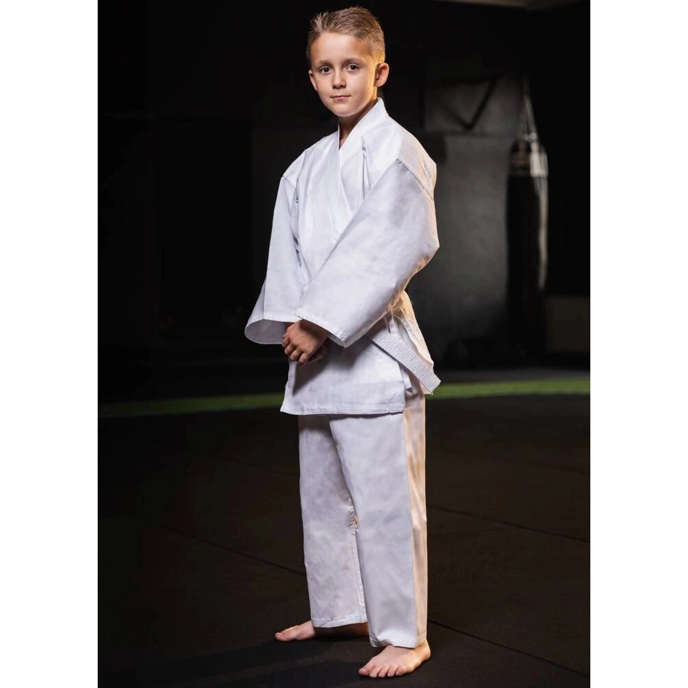 De praktische snit met verstevigingen in het kruis en langs de randen van de jas verhoogt de duurzaamheid bij regelmatig trainen. De broek heeft een dubbele sluiting – elastiek en koord, waardoor hij niet afzakt en goed blijft zitten, ook tijdens dynamische combinaties. De set bevat een witte band, zodat kinderen meteen aan de slag kunnen.