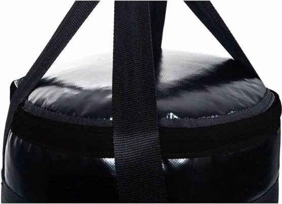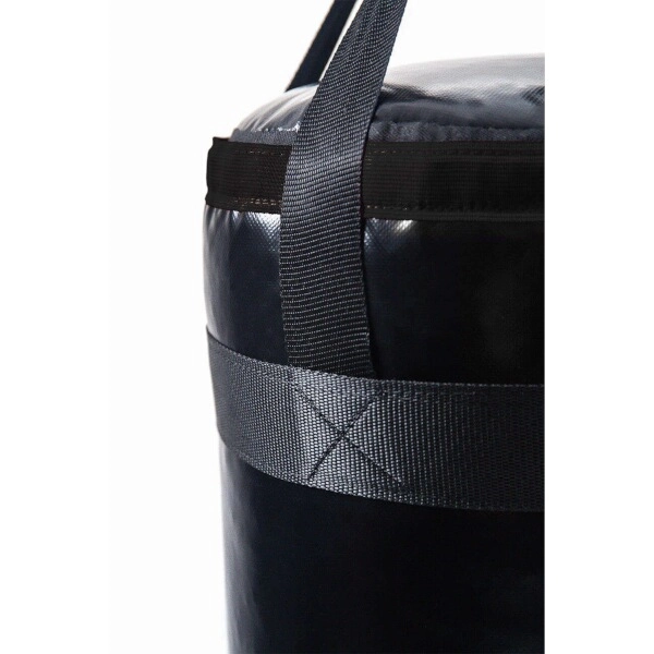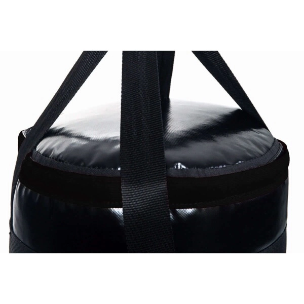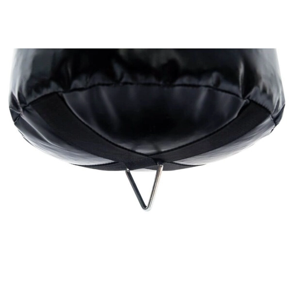 Twee brede banden met stalen ogen en een centrale ophanging zorgen voor een veilige bevestiging, terwijl de D-ring aan de onderzijde het vastzetten met een expander aan de vloer mogelijk maakt om het zwaaien te beperken. De totale hoogte met ophanging is ongeveer 120 cm, waardoor de zak perfect past in zowel een homegym als een clubruimte.