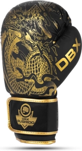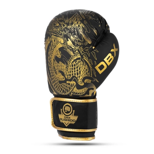 Premium bokshandschoenen DBX Bushido Gold Dragon van duurzaam synthetisch leer met een brede klittenbandmanchet voor stevige polsfixatie. Ademende handpalm met ventilatieopeningen en vulling van speciale memory PUR-schuim zorgen voor comfort, ook tijdens intensieve training op bokszak, pads en in sparring.