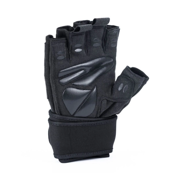 Versterkte rubberen pads over de hele handpalm verhogen de wrijving en voorkomen dat halters, rekstangen en kettlebells wegglijden.