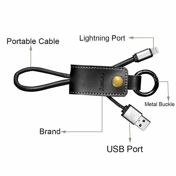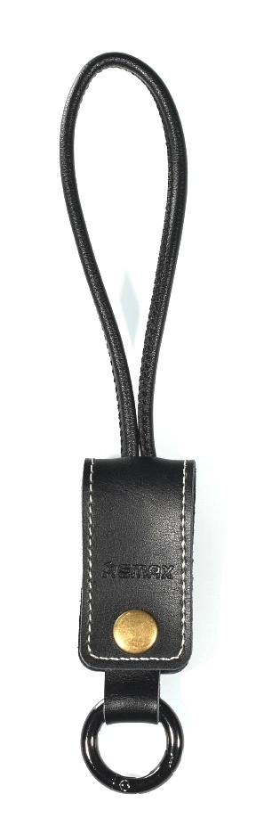 Stijlvolle en praktische kabel Remax West RC-24i in de vorm van een retro sleutelhanger waarmee je snel kunt opladen en gegevens kunt overzetten. Voorzien van micro USB- en Lightning-connectoren, met een compacte lengte van 32 cm en een elegant design in zwart leer.
