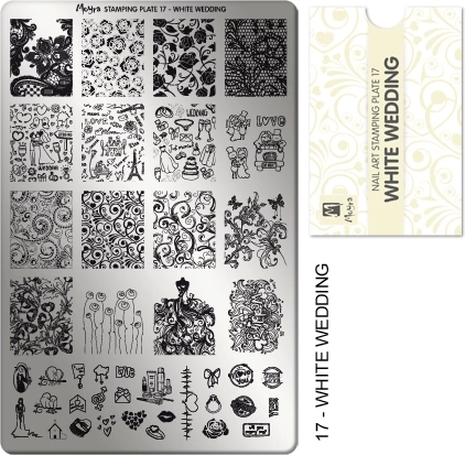 Ontdek de charme van een perfecte manicure met huwelijksthema dankzij de plaat Moyra 17 Wedding. Het brede palet aan romantische motieven – fijne kant, bloemen, hartjes en opschriften – helpt je een precies en uniform design op elke nagel te maken zonder te tekenen.