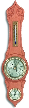 Elegante wandanaloge TFA-weerstation van massief kersenhout combineert een barometer, thermometer en hygrometer in één stijlvol geheel. Valt op door gouden ringen, precieze afwerking en overzichtelijke wijzerplaten voor eenvoudig aflezen.
