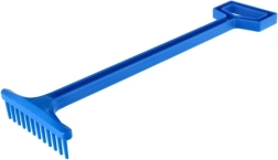 De lange steel en de gevormde uiteinde zorgen voor een stabiele grip bij het harken van zand en bladeren.