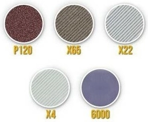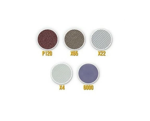 - Brede dekking van korrelgroottes: P120 voor snel corrigeren van de snede, X65 en X22 voor vormen, X4 voor voorpolijsten, P6000 voor de eindpolijst.