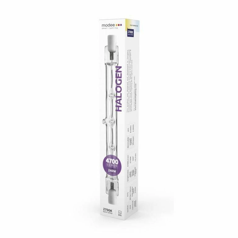 De halogeenlamp MODEE R7S 118 mm 240 W uit de ECO-serie biedt directe volledige helderheid, dimbare lichtstroom en warm wit licht van 2700 K. Dankzij de hoge lichtopbrengst van 4700 lm en de stralingshoek van 360° verlicht hij zowel binnen- als buitenruimtes uitstekend. Een speciale interne coating weerkaatst infraroodstraling voor hogere efficiëntie.