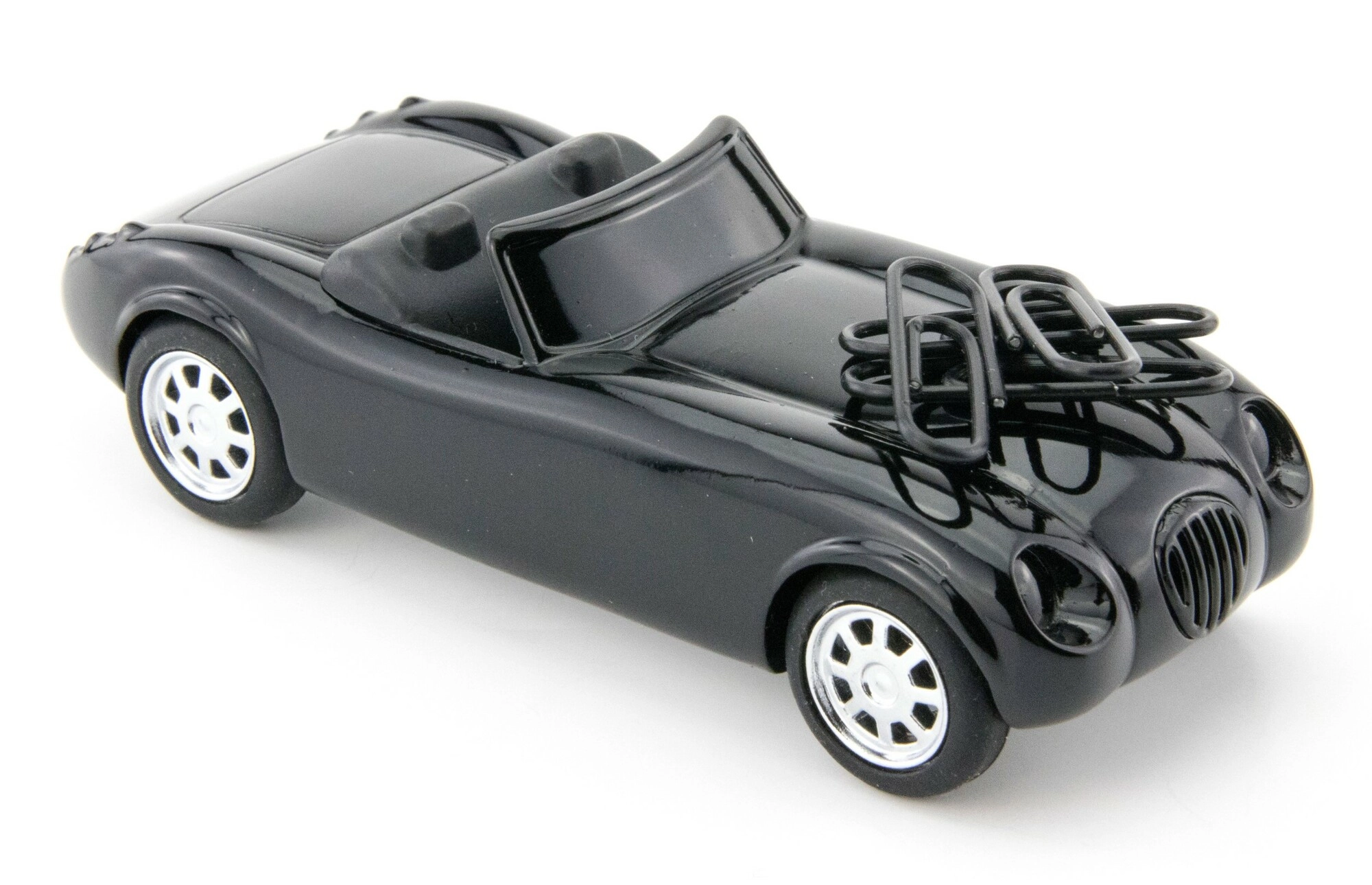 Stijlvolle papercliphouder TROIKA Road Star in de vorm van een retro sportwagen uit de jaren 50 combineert design en functionaliteit. Dankzij de geïntegreerde magneet houdt hij je paperclips veilig vast en met het oplichtende model met frictiemotor geef je je bureau extra flair. Gemaakt van mat grijs‑zwart gegoten metaal, inclusief 5 metalen paperclips in de verpakking.