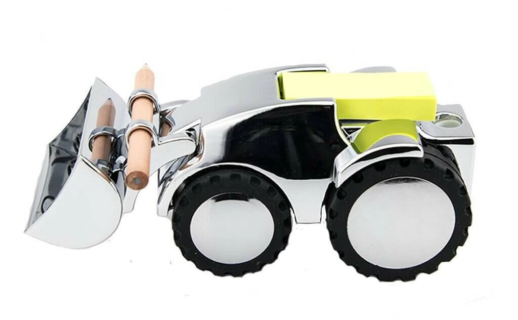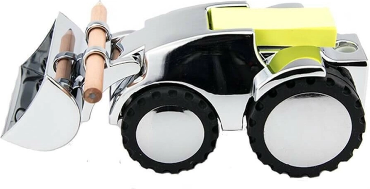 Stijlvolle bureau-organizer in de vorm van een graafmachine die speels design met slimme functionaliteit combineert. Biedt een magneet voor paperclips, een puntenslijper, een houder voor pen/potlood inclusief 1 potlood en een dispenser voor zelfklevende memo’s (80 vel) – alles op één plek voor een opgeruimd bureau.
