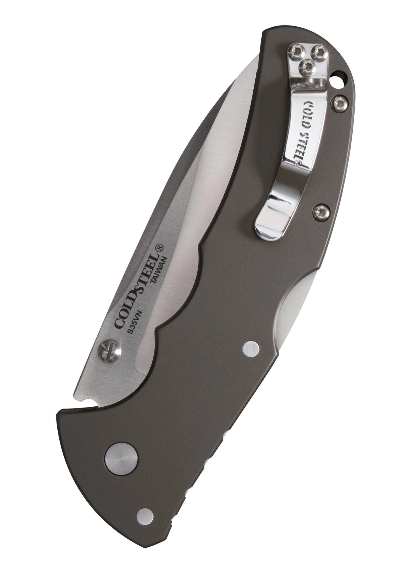 De veiligheid wordt gewaarborgd door de Tri-Ad-vergrendeling, bekend om zijn extreme torsie- en drukkracht. Voor snel en comfortabel openen zorgen de dubbelzijdige duimpinnen. Dunne maar stevige schalen van geanodiseerd 6061-aluminium in een elegante grijze kleur liggen prettig in de hand en garanderen samen met de broekclip onopvallend draagcomfort.