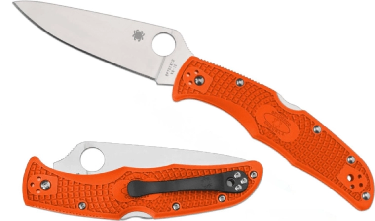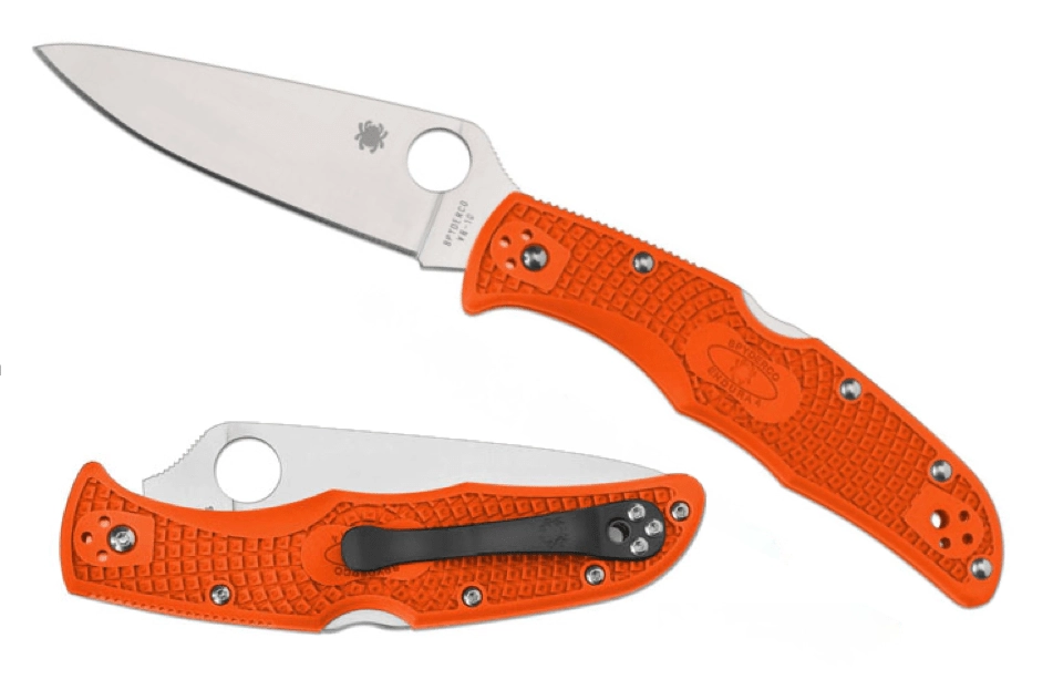 Licht en duurzaam zakmes Spyderco Endura 4 Flat Ground in oranje kleur, ideaal voor dagelijks EDC-gebruik en voor vissers. Biedt een gladde snede van hoogwaardig Japans staal VG-10 met een satijnafname, een betrouwbare Back Lock en een stevige grip dankzij de getextureerde FRN-handgreep.