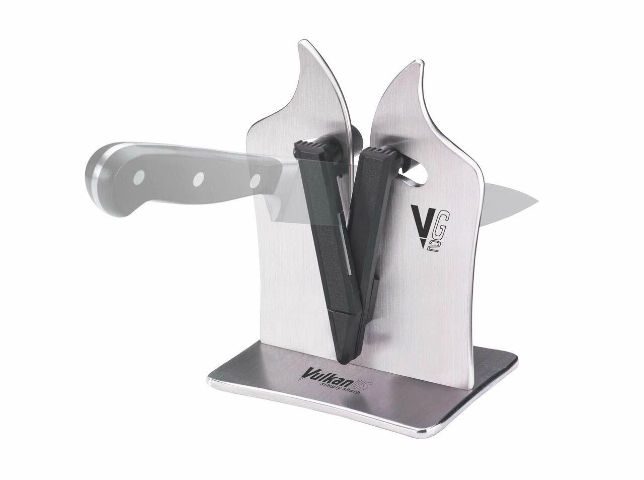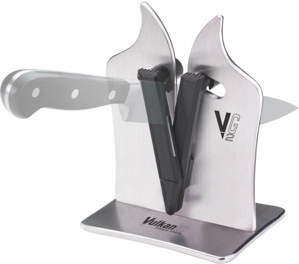 De professionele messenslijper VULKANUS Professional G2 slijpt en polijst keukenmessen en gereedschap doeltreffend. Geschikt voor rechte en gekartelde snedes, past zich automatisch aan de hoek van het lemmet aan en verhit de snede niet tijdens het slijpen. Eenvoudig onderhoud – vaatwasserbestendig.