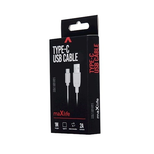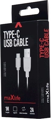 Universele witte Maxlife‑kabel met USB‑C‑connector voor snel opladen tot 2 A en betrouwbare gegevensoverdracht voor moderne smartphones en andere apparaten. Dankzij de lengte van 1 m is hij handig thuis, op kantoor en onderweg, terwijl het flexibele ontwerp het dagelijks gebruik vergemakkelijkt.
