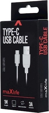 Praktische Maxlife‑kabel met USB‑C‑connector voor snel en betrouwbaar opladen en gegevensoverdracht. Biedt een stroomsterkte tot 3 A, ondersteuning voor snelladen, een lengte van 1 meter en een duurzame, flexibele constructie in een elegante witte kleur.