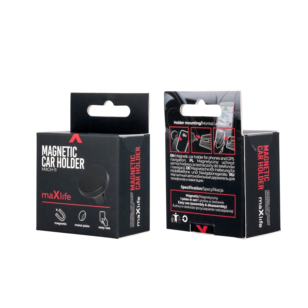 De universele magnetische houder Maxlife voor bevestiging op het ventilatierooster is ontworpen voor snel en comfortabel gebruik. Met het magnetische systeem plaats je je telefoon eenvoudig en kun je direct vertrekken – zonder langdurig afstellen. De compacte afmetingen en het strakke ontwerp verstoren het interieur van de auto niet en passen in vrijwel elk rooster.