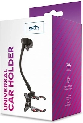 De praktische Setty Froggy autohouder met een lange zwanenhals zorgt ervoor dat je smartphone altijd in het zicht en veilig binnen handbereik is. Dankzij de zuignap bevestig je hem eenvoudig op de voorruit en met de draaibare kop stel je elke gewenste hoek in, liggend of staand. De universele clip past voor de meeste telefoons dankzij een maximale spreiding van 11,5 cm en de arm van 20 cm zorgt voor optimale zichtbaarheid zonder het uitzicht te beperken.