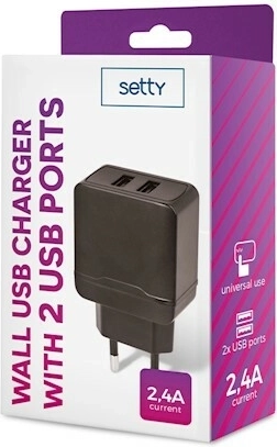 De compacte SETTY netstroomoplader met twee USB-poorten maakt gelijktijdig opladen van twee apparaten mogelijk met een vermogen tot 2,4 A. Het elegante zwarte design, de universele ingang van 100–240 V en de betrouwbare uitgang van 5 V / 2,4 A maken het een ideale keuze voor dagelijks gebruik thuis en onderweg.
