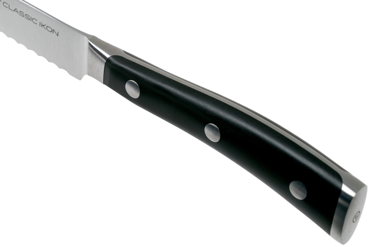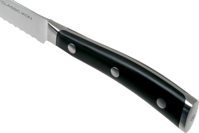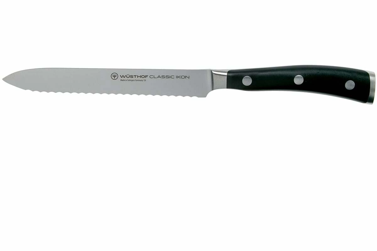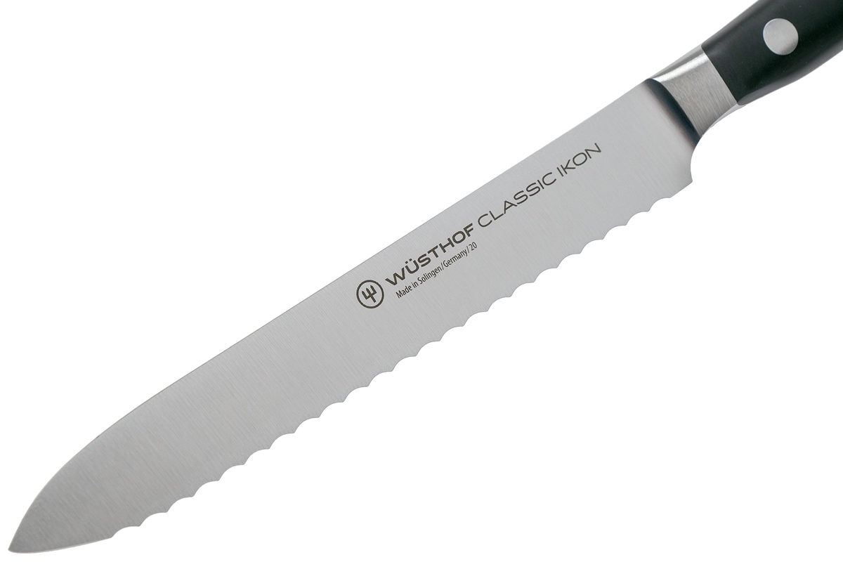 Het Wüsthof CLASSIC IKON universele gekartelde mes van 14 cm is precies die hulpmiddel waar je elke dag naar grijpt. De gekartelde snede bijt zeker in hardere oppervlakken en gaat moeiteloos door de knapperige korst van een baguette, de schil van een tomaat en zelfs door sappige meloen. Dankzij de uitgebalanceerde constructie met full tang heb je uitstekende controle tijdens het snijden.