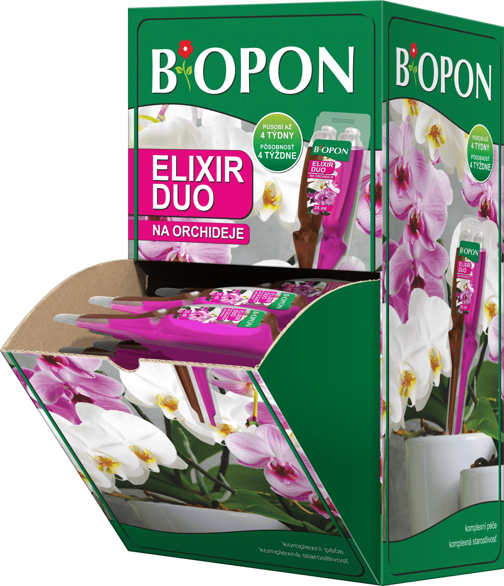 Ideaal voor orchideeën met zwakke groei, onvoldoende bloei of een minder fraai uiterlijk, en werkt even goed als preventieve verzorging om gezondheid en vitaliteit te behouden. De dubbele applicator maakt gelijktijdige en nauwkeurige dosering van beide componenten mogelijk – eenvoudig, snel en zonder risico op fouten.