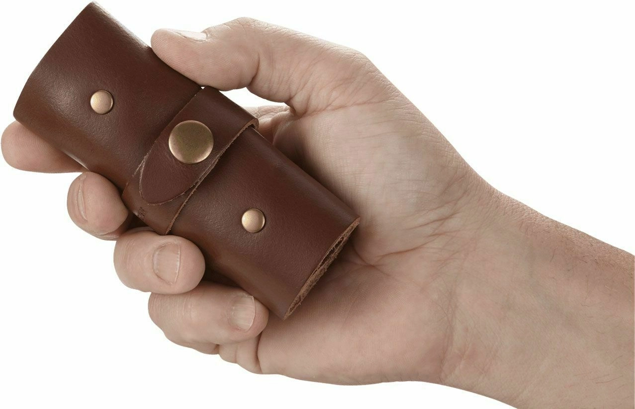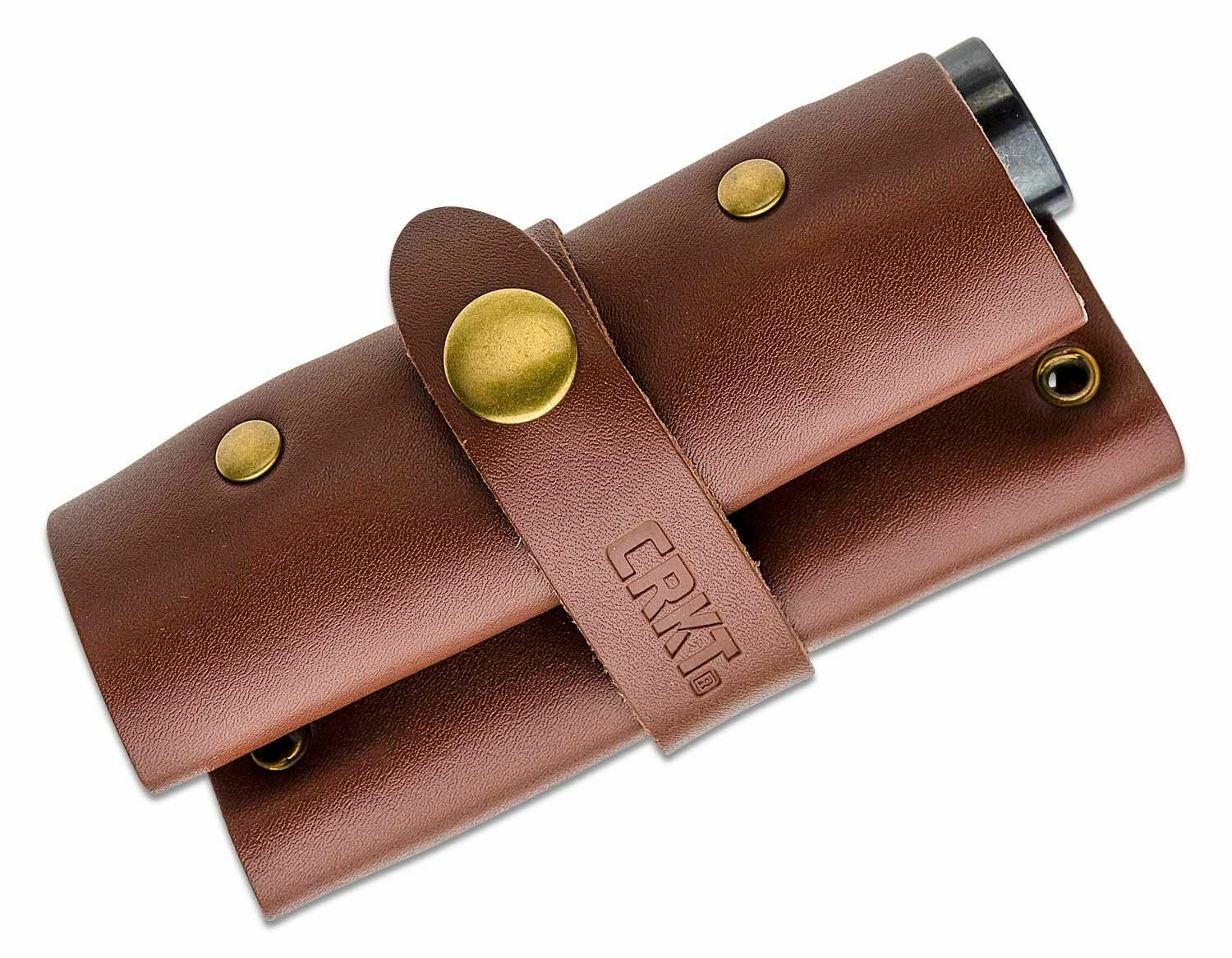 Duurzaam rol etui van echt leer met messing drukkers beschermt de tools en houdt ze overzichtelijk geordend tijdens het reizen.