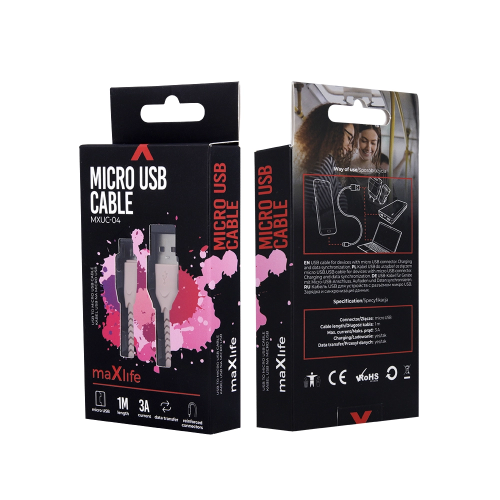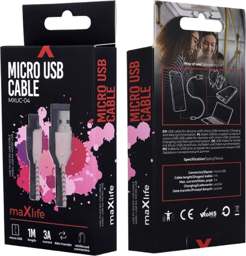 Op zoek naar een praktische en robuuste kabel voor apparaten met microUSB? Deze roze Maxlife-kabel biedt snelle gegevensoverdracht en efficiënt opladen met ondersteuning tot 3 A. Dankzij de nylon gevlochten mantel is de kabel bestand tegen knikken en in de knoop raken, terwijl de versterkte connectoren beschermen tegen afbreken.