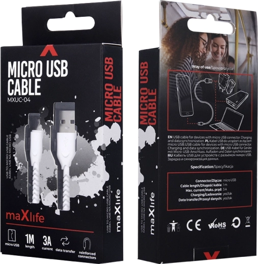 Praktische microUSB-kabel van Maxlife in het wit, ideaal voor het opladen van telefoons, tablets en andere apparaten met een microUSB-aansluiting. Ondersteunt tot 3 A voor snel en stabiel opladen en tegelijkertijd een betrouwbare gegevensoverdracht.