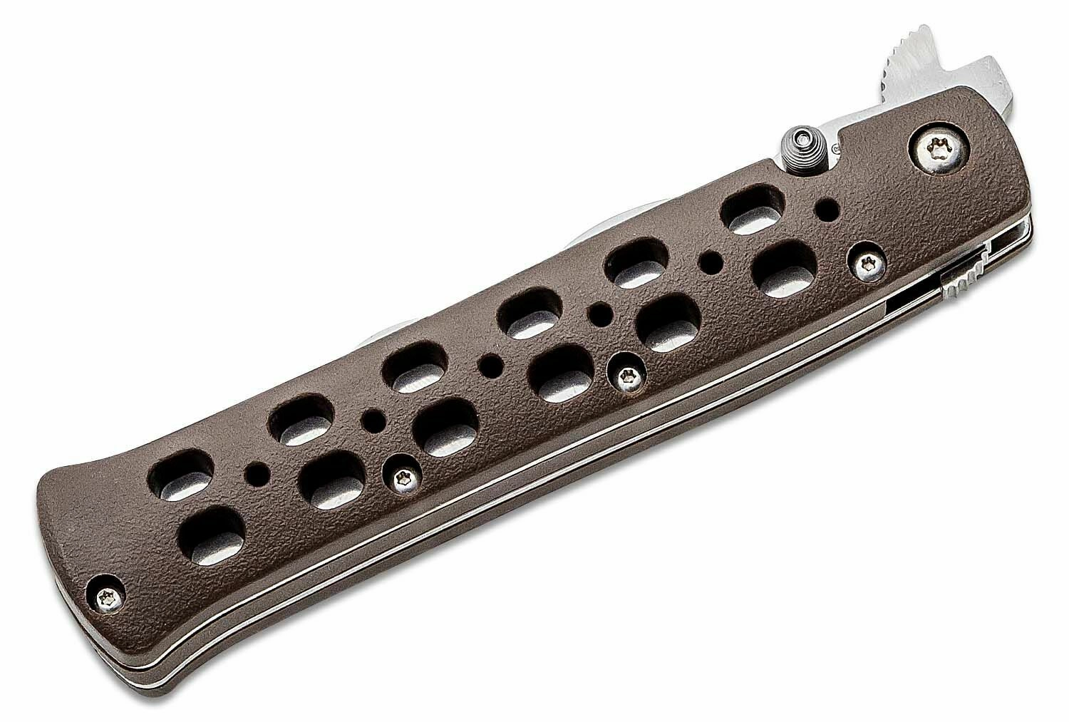 Het lemmet van Japans roestvast AUS-10A staal met satijnen slijping biedt een uitstekende balans tussen scherpte, taaiheid en corrosiebestendigheid. Het frame borgt een stevige veer-vergrendeling van Cold Steel met een opgegeven belastbaarheid tot ca. 66 kg, zodat je kunt vertrouwen op veiligheid bij veeleisende taken. De ergonomische bruine greep van Zy-Ex is licht, sterk en prettig getextureerd voor een zekere grip.