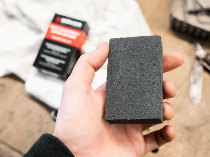Uitstekend geschikt voor dagelijks onderhoud van keuken- en outdoormessen, gereedschap en metalen onderdelen. Gebruik is eenvoudig – wrijf het aangetaste gebied lichtjes en verhoog geleidelijk de druk indien nodig. Voor het beste resultaat reinig je op een droog of licht vochtig oppervlak en werk je met gelijkmatige halen in de schuurrichting.
