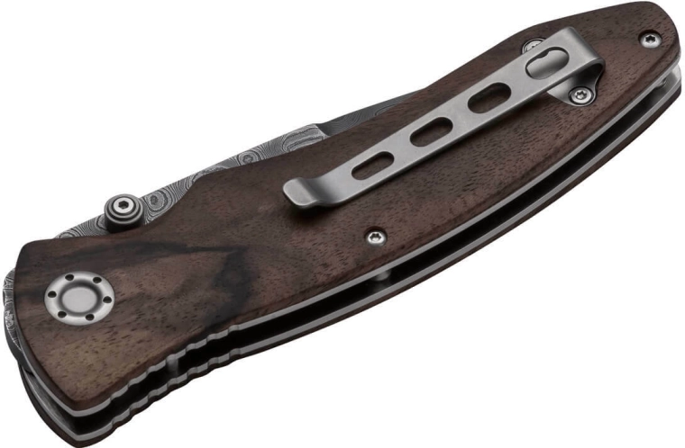 De ergonomische handgreep van mat walnotenhout is CNC-gefreesd met een 3D-structuur voor een zekere en comfortabele grip. Het mes opent met een tweezijdige duimstud en vergrendelt veilig met een Linerlock. Aan de voorzijde vindt u het wapen en de naam Tirpitz, die de exclusiviteit en herkomst van het mes onderstrepen. Een praktische clip maakt discreet dragen in de broekzak mogelijk.