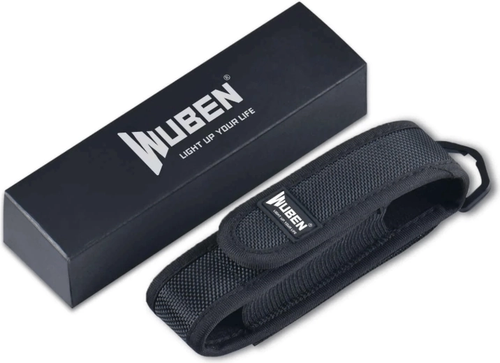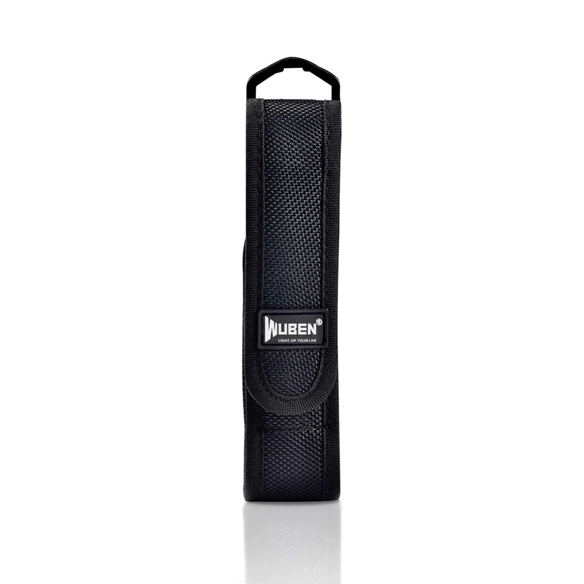 Duurzaam nylon hoesje Wuben AS5 met hittebestendige voering, precies stiksel en dubbelzijdige versterkte klittenbandsluiting voor veilig en comfortabel dragen van je zaklamp. Inclusief opbergvak voor batterijen en compatibel met de meeste zaklampen op 18650/21700.