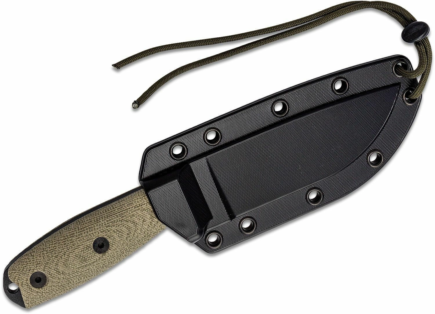 Het handvat van duurzaam Micarta met getextureerde 3D-frezing biedt uitstekende tractie, ook bij natte omstandigheden. Dankzij het koordoog kan het mes met een lus worden gezekerd of met paracord worden aangevuld. De lichte kunststof lemmetbeschermer vergemakkelijkt veilig dragen en snelle toegang tot het gereedschap.