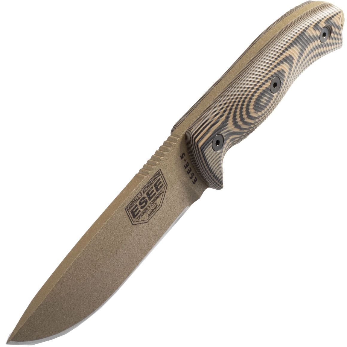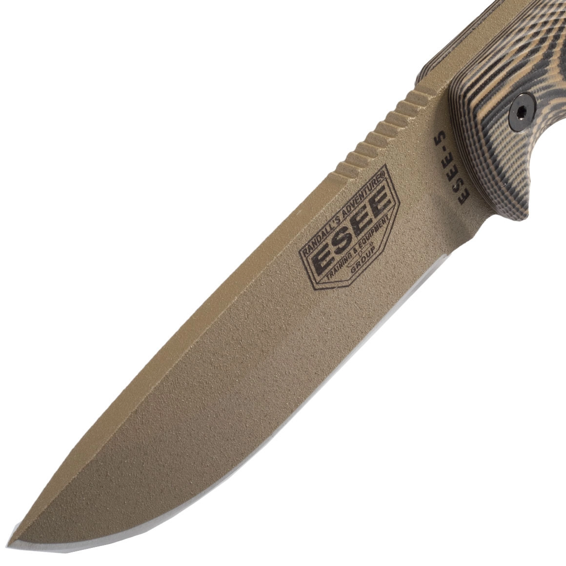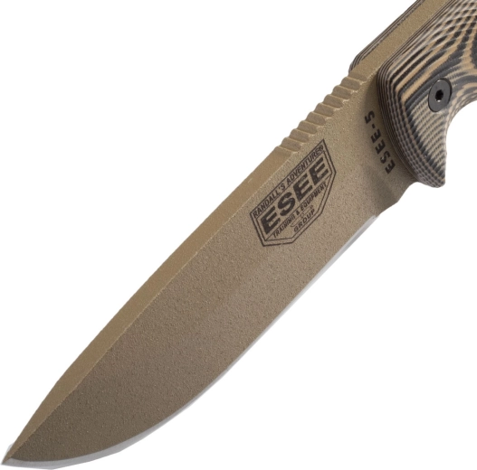 Het ESEE Model 5 mes werd oorspronkelijk ontwikkeld voor militaire piloten als reddingsmiddel in noodgevallen. Het 13,2 cm lange lemmet van 1095 koolstofstaal met Dark Earth poedercoating snijdt, splijt en bewerkt hout uitstekend en is tegelijk beschermd tegen corrosie en slijtage. De volledige, doorlopende rat-tail/full‑tang constructie levert maximale sterkte en zekerheid bij zwaar werk in het veld.