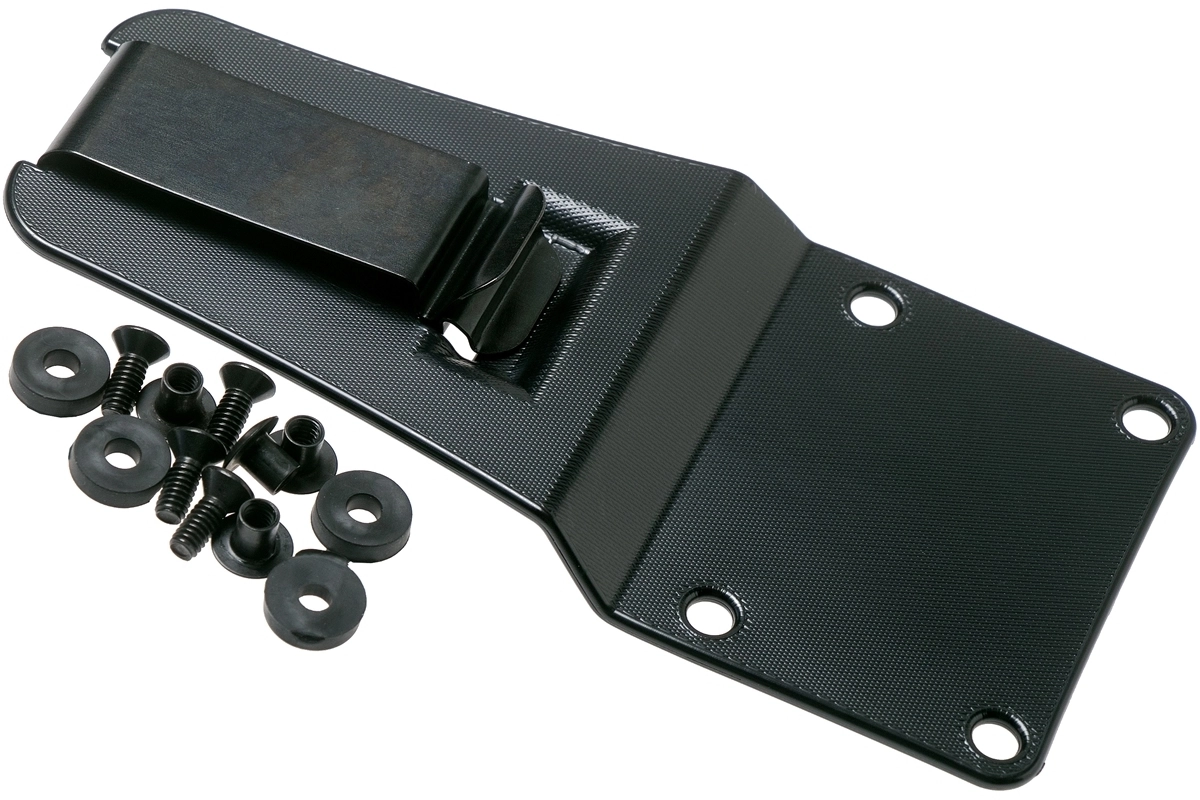 Duurzame Kydex schede met meerdere oogjes en een afneembare clip maakt een veilige en variabele bevestiging aan riem of uitrusting mogelijk.