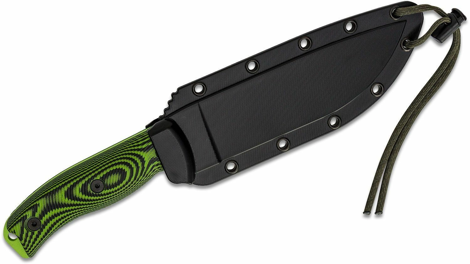Robuust survivalmes ESEE Model 6 Venom met een vaste lemmet van 16,5 cm van 1095 koolstofstaal en een neon‑groene coating voor hoge zichtbaarheid in het veld. Volledig full‑tang opgebouwd, met een ergonomisch 3D G10‑handvat in zwart‑groen en een slijtvaste kunststof schede – een betrouwbare tool voor in de natuur, kamperen en noodgevallen.