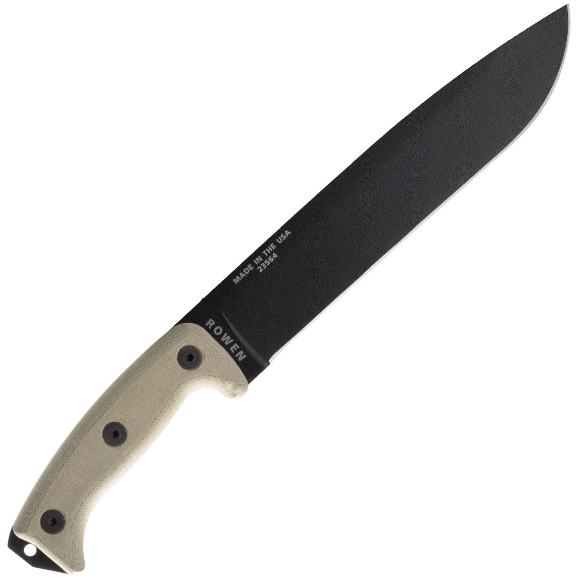1095 koolstofstaal houdt de snede uitstekend vast en is ideaal voor hakken en veeleisende bushcrafttaken. De zwarte poedercoating verhoogt de duurzaamheid en vermindert schittering.