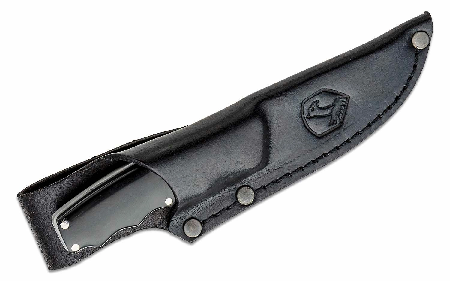 De handgreep van duurzaam composiet G10 in zwarte kleur biedt een zekere en comfortabele grip, ook met handschoenen of in natte omstandigheden. Inbegrepen is een hoogwaardige leren schede voor veilig en stijlvol dragen aan de riem.