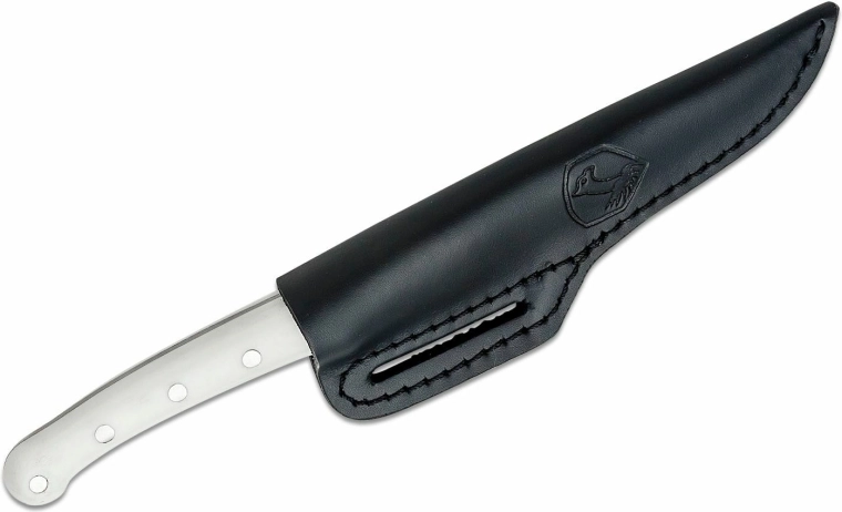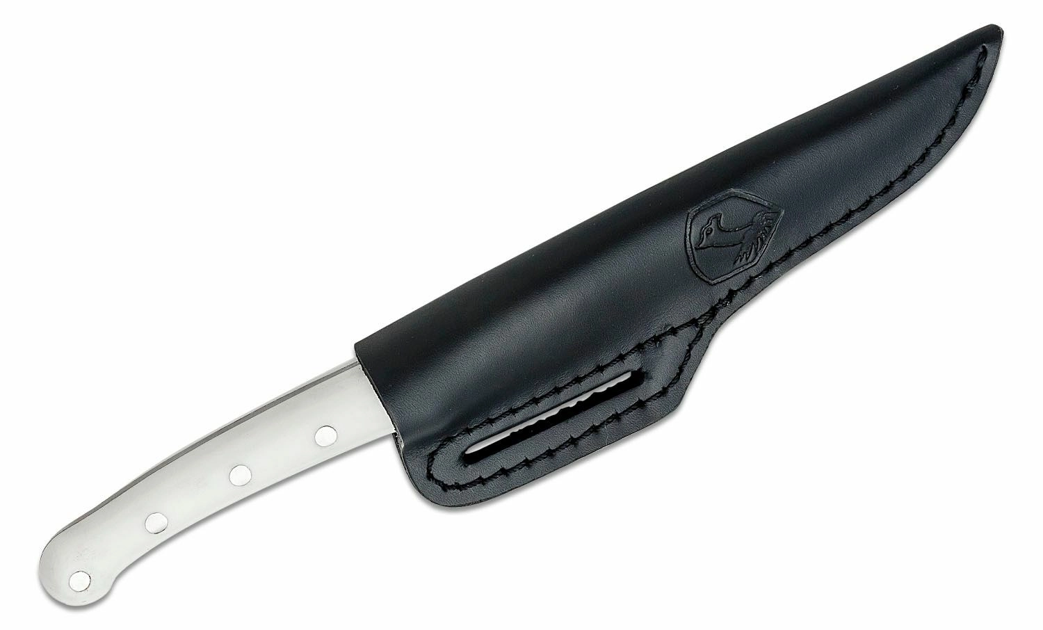 De ergonomische witte greep van het slijtvaste Micarta biedt een zekere grip, ook bij vocht, terwijl de klinknagelbevestiging de algehele duurzaamheid versterkt. Het mes wordt geleverd met een leren schede voor veilig en comfortabel dragen aan de riem.