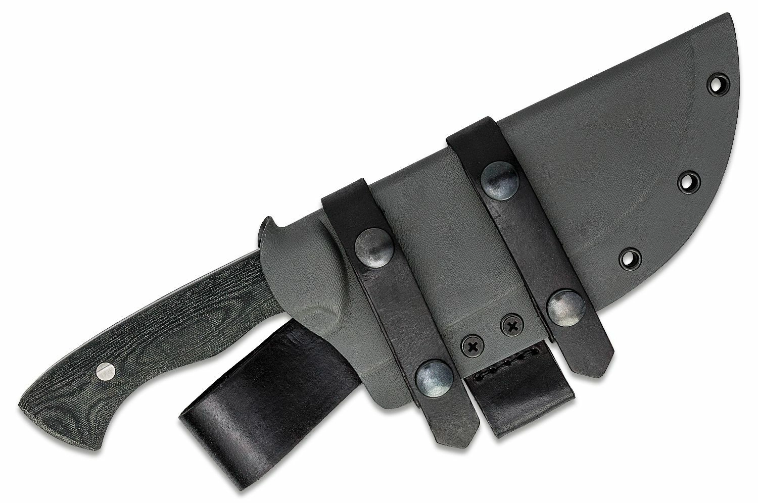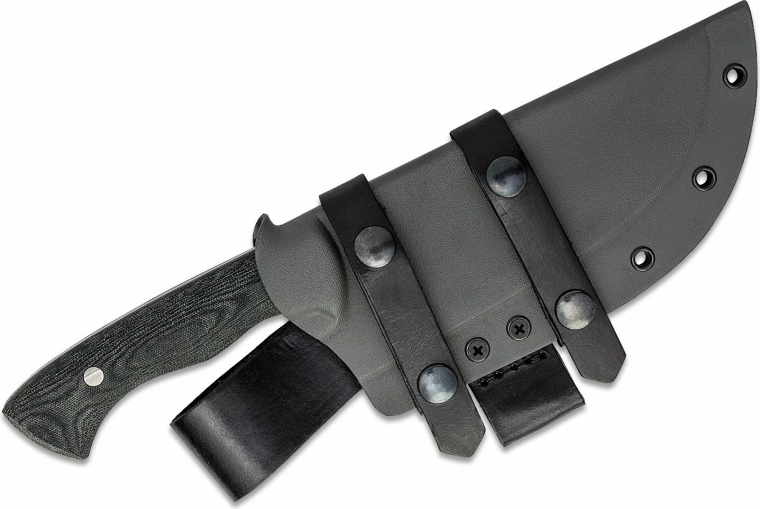 De ergonomisch gevormde handgreep van Micarta in grijze kleur biedt een veilige en comfortabele grip, ook onder veeleisende omstandigheden. Meegeleverd wordt een gecombineerde schede van kydex en leer voor veilig dragen en snelle toegang in het veld. Om de eigenschappen van koolstofstaal te behouden, raden we aan het lemmet na gebruik te drogen en af en toe met olie te onderhouden.