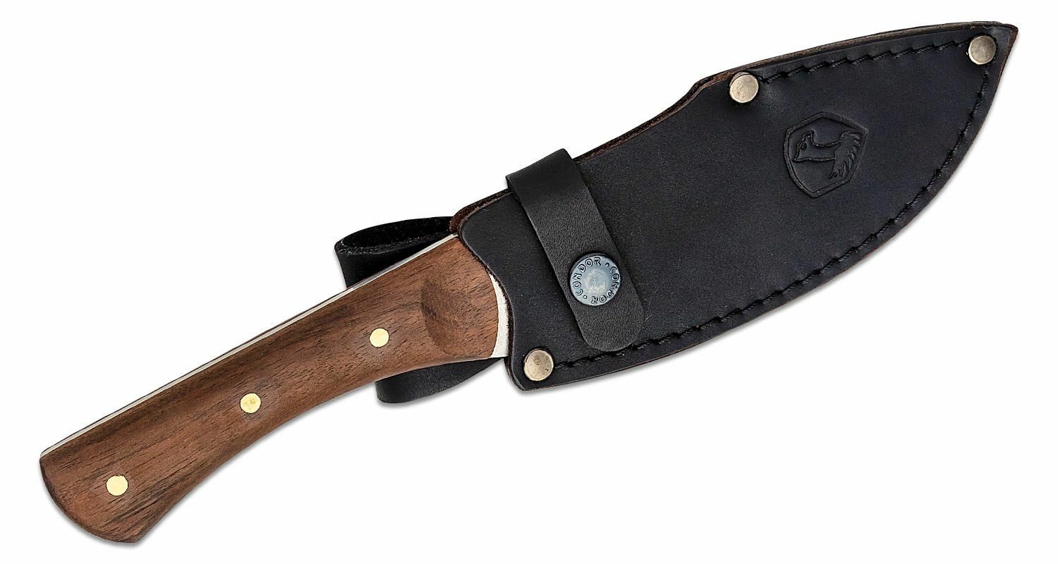 Staalsoort 440HC biedt een gebalanceerde combinatie van corrosiebestendigheid, snij-edge retentie en eenvoudig slijpen. Het ergonomisch gevormde handvat van walnotenhout biedt een zekere en comfortabele grip, ook bij langdurig gebruik. De donkere lederen schede maakt veilig opbergen en dragen aan de riem mogelijk.
