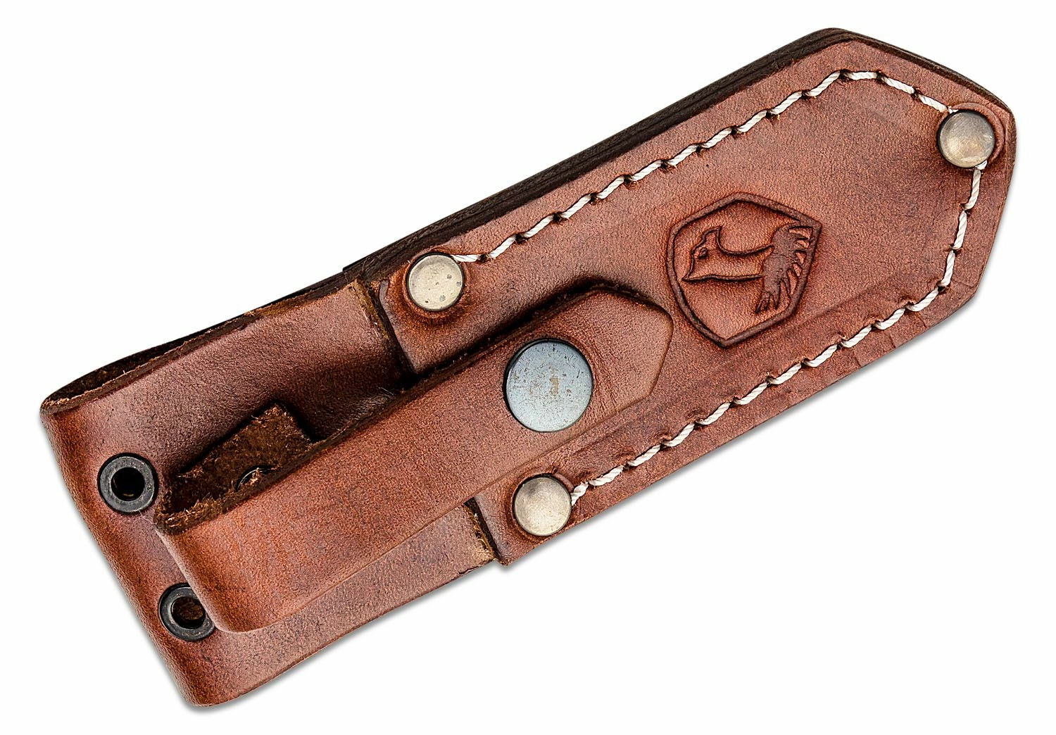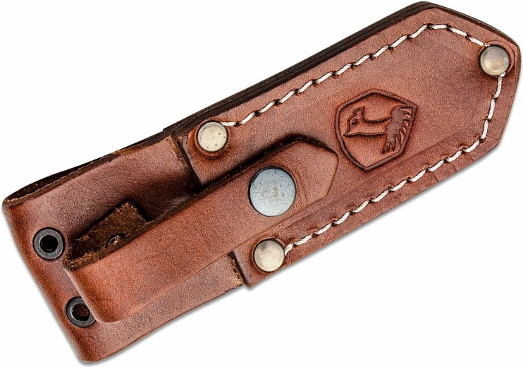 De handgreep van bruine Micarta is gevormd voor een zekere grip en het getextureerde oppervlak blijft houvast bieden, zelfs onder zware omstandigheden. De dolk wordt geleverd met een hoogwaardige lederen schede, die veilig en comfortabel dragen bij dagelijks gebruik mogelijk maakt.