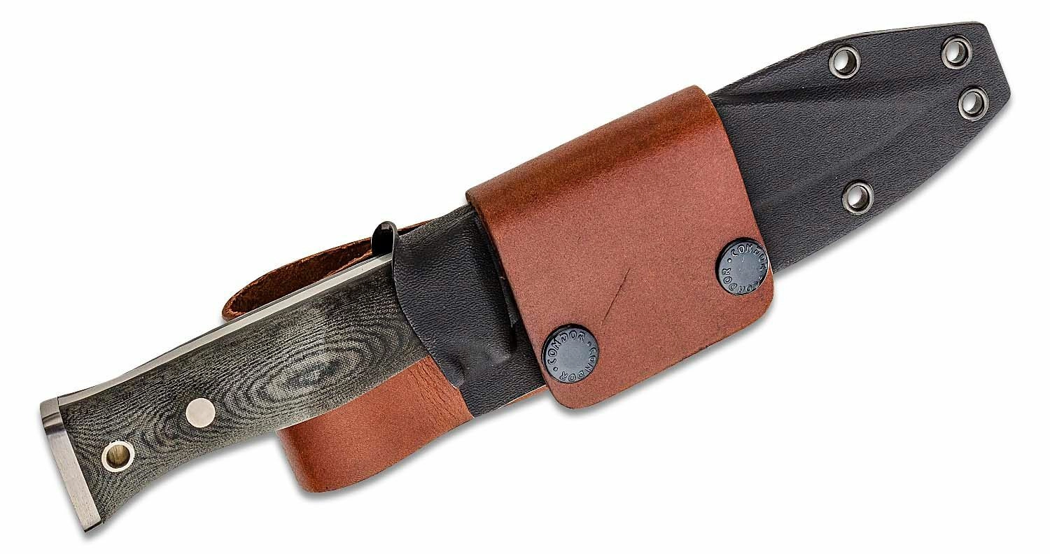 Het geribbelde Micarta handvat in zwart-grijs ligt zeker in de hand, ook met handschoenen, en biedt aan het uiteinde een slag- en ruitbreekdop. De doorlopende full-tang constructie verhoogt de duurzaamheid bij batonneren en zwaardere taken. Bij het mes ontvangt u een gecombineerde Kydex + leren schede voor veilig en veelzijdig dragen.